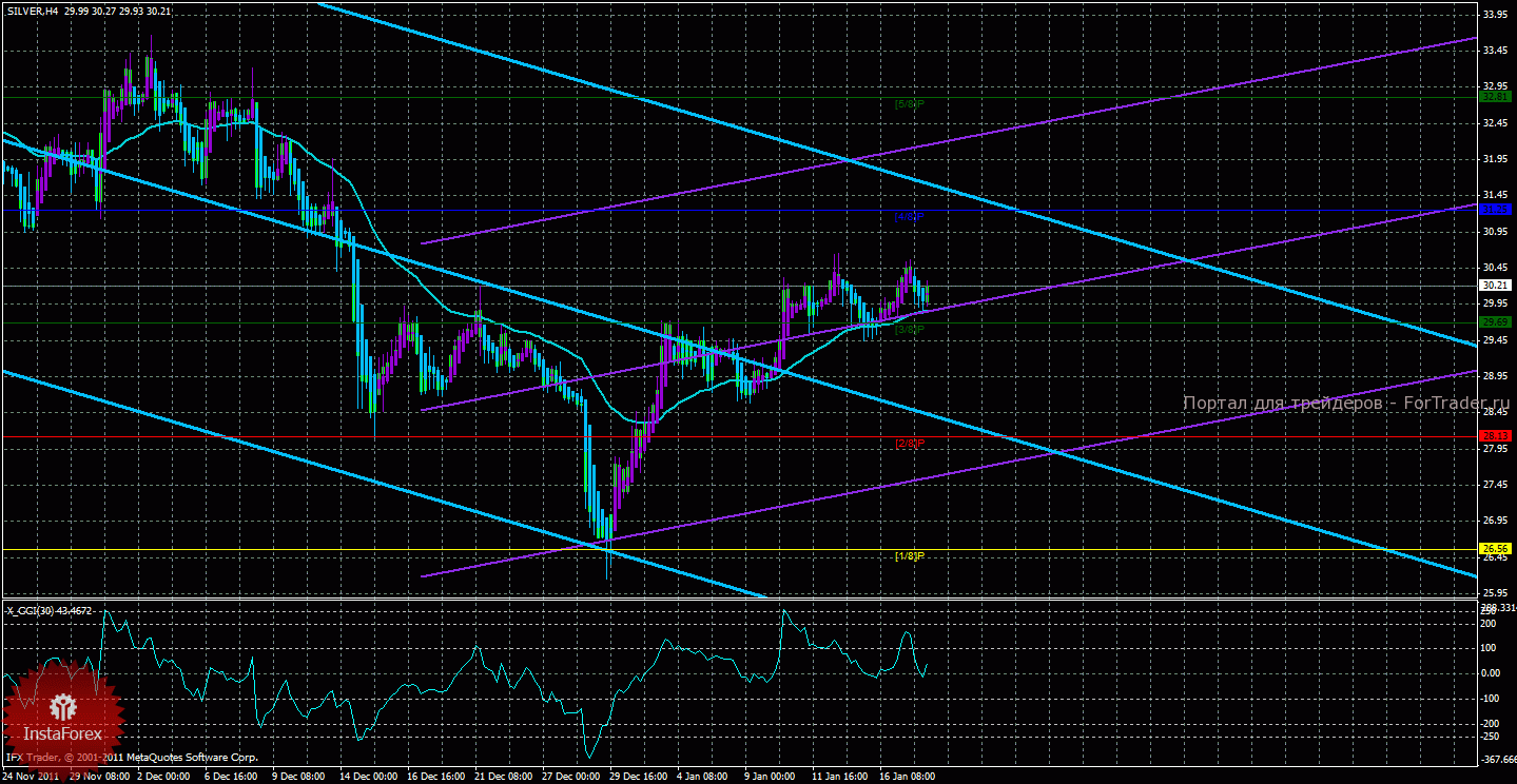 Исходя из анализа серебра 18 января видно, что курс находится в восходящем тренде и, следовательно, актуальны длинные позиции, Хайкен Аши указывает на небольшую коррекцию. Старший канал направлен вниз, что свидетельствует о нисходящем направлении движения глобального тренда. Младший канал направлен вверх, что означает восходящее движение в менее долгосрочном плане. Сейчас цена находится выше мувинга и выше уровня Мюррея «3/8», что делает актуальным восходящее движение. Первой целью восходящего движения является уровень Мюррея «4/8» — 31,25, и торговать на повышение с этой целью можно. В случае преодоления первого целевого уровня, восходящее движение продолжиться с целью «5/8» — 32,81. Скользящая средняя направлена вверх, а цена в свою очередь находится выше нее, что сигнализирует о текущем восходящем движении. Короткие позиции можно будет рассматривать только после закрепления цены ниже мувинга. Хайкен Аши окрасил несколько баров в голубой цвет, что сигнализирует о возобновлении локального нисходящего движения, поэтому сейчас ордера на покупку открывать не рекомендуется до возобновления главного тренда. Индикатор CCI находится около нулевого уровня, что свидетельствует об отсутствии какой-либо перекупленности или перепроданности курса серебра.