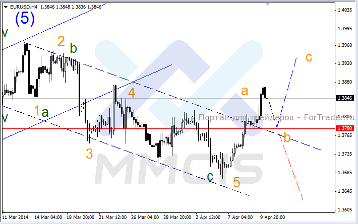 В качестве основного сценария рассматривается рост пары от уровня 1.3780 в направлении волны «с» к отметке 1.3950. В качестве альтернативного сценария рассматривается пробой уровня поддержки 1.3780, после чего рынок будет стремиться к минимуму волны «5», в район уровня 1.3700.