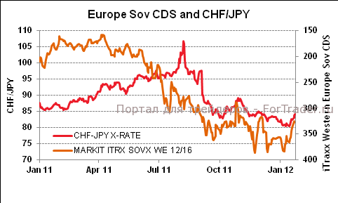 Иена более всего выделялась среди основных валют за последние 24 часа и с начала года, а также это единственная валюта, которая в целом в целом ослабела к доллару. Торговые данные за 2011 год вызвали сильную реакцию, так как этот год стал первым полным годом дефицита более чем за 30 лет, несмотря на тот факт, что данные оказались лучше прогнозов. Тем не менее, эти новости сильно повлияли на последние события. Есть ощущение, что многие были застигнуты врасплох во время вчерашнего роста в паре USD/JPY, что привело к покрытию растянутых коротких долларовых позиций (что видно из данных CFTC), а доллар меньше торговался как рисковый актив, чем в обычных ситуациях от него можно было ожидать, учитывая хорошие показатели акций с начала года. Тем не менее, интересно отметить более высокую обратную корреляцию пары CHF/JPY по отношению к рисковым настроениям в Европе за последние три месяца вместе с ростом пары CHF/JPY на фоне улучшения суверенного индекса CDS для европейских правительств (см. график). Это подтверждает то, что иена все более связана с настроениями в Европе, нежели швейцарский франк, который по-прежнему ограничен потолком. Если так продолжится, тогда судьба иены больше зависит от Европы, нежели от Азии в ближайшие месяцы.