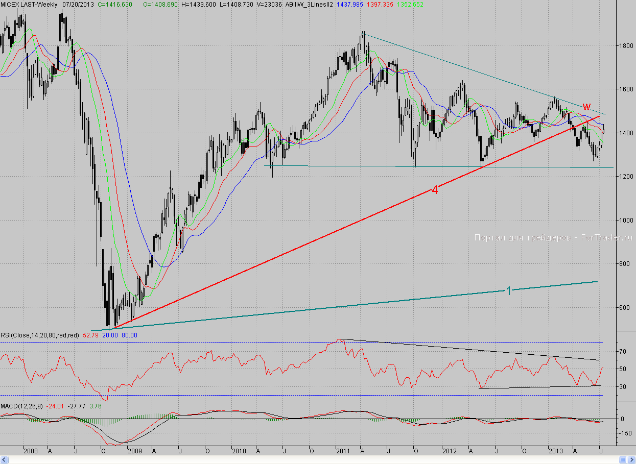 Сегодня заключительный день торговой недели, и пока она завершается неплохо для покупателей – впервые за три месяца индекс «по неделям» по Б.Уильямсу выходит из продажи. Однако особо отступать быкам нельзя, ведь если снижение превысит 0,5%, то форма недельной свечи станет малообещающей для них. Так что им надо держать оборону и по возможности наступать. В этом случае роль ближайшего сопротивления снова сыграет уровень 50%-ной коррекции, а далее – вчерашний максимум. Напомним, что целью роста является кластерная зона, в которой проходит верхняя граница растущего канала (5-5**), а также находятся уровень 62%-ной коррекции и недельный фрактал на покупку W (1453,6 п.).
