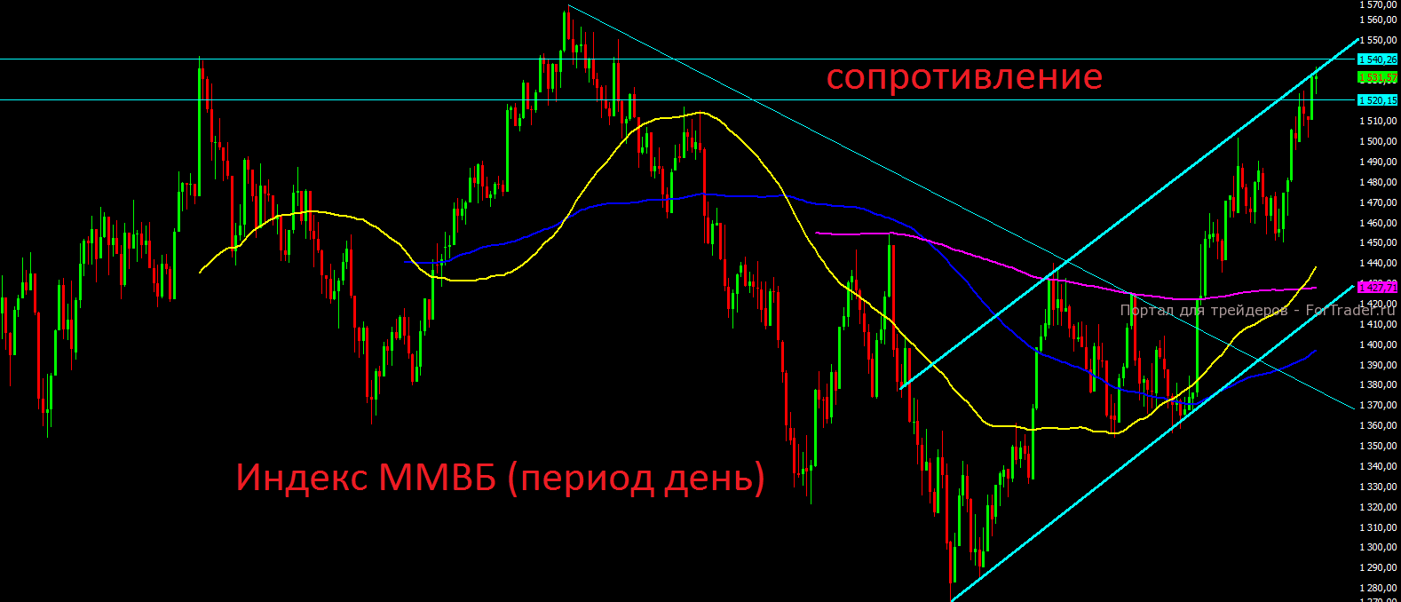 На дневном графике индекса ММВБ, цена по-прежнему продолжает карабкаться вдоль верхней границы восходящего канала и уж больно сильно напрашивается здесь небольшая передышка и коррекция в пределах 5-7% перед возможно новым заходом вверх. Не исключено, что мы увидим и выход вверх из этого канала, но делать ставку на то, что он будет сильным, явно не стоит.