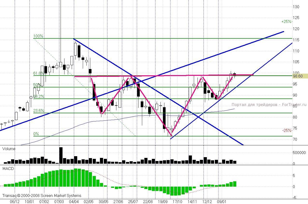 Почему? А вы помните, что такое «перевернутая голова-плечи»? Фигура разворота. И что нашей «красотке» разворачивать? Великий тренд, который укатал бумаги чуть больше чем на 14,5% за 4 недели? К разворотам таких трендов по 8 месяцев (сколько формировалась фигура) – не готовятся. Тем не менее, сбрасывать совсем со счетов её не будем, учтем как знаковый рубеж её линию «шеи», которая тоже лежит в районе 99 рублей.