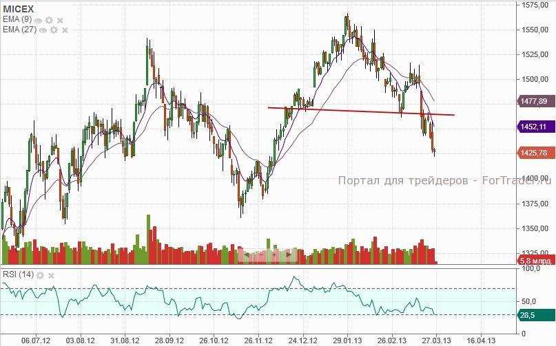 Общий тренд сейчас прослеживается только в сторону падения. В условиях сильной напряженности с Кипром, про рост котировок говорить не приходится. Выделяются лишь некоторые фишки. Технически, индекс ММВБ движется к уровню 1400 пунктов, где его можно будет ожидать уже в конце текущей недели.