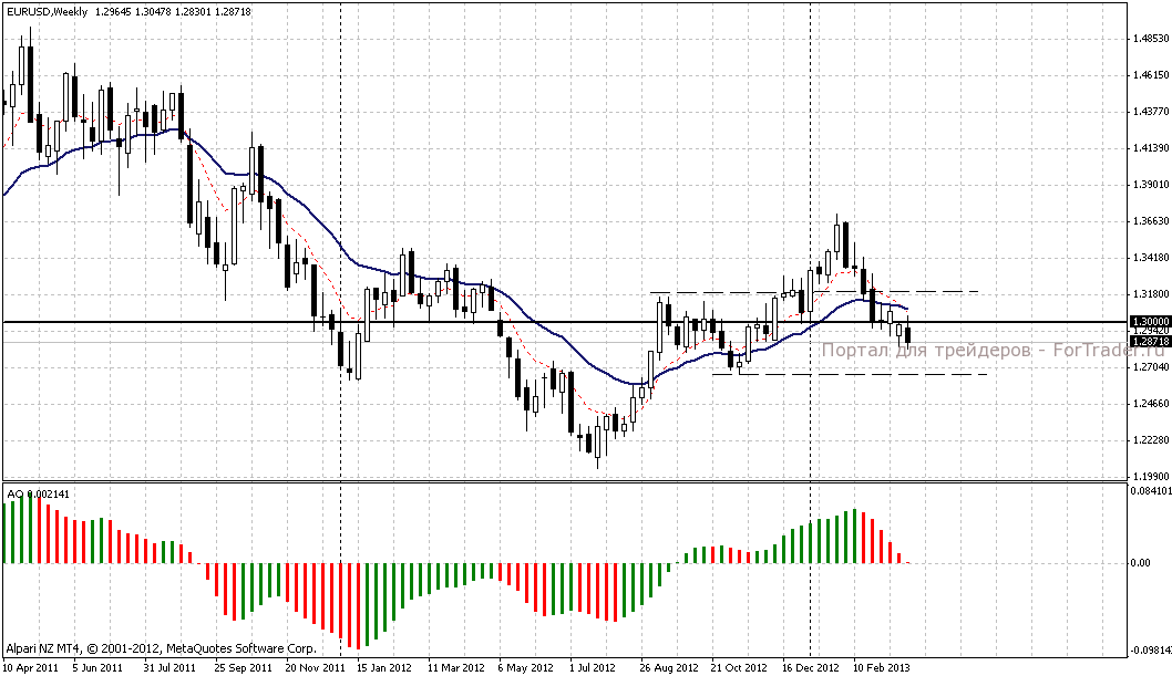 На недельном графике валютной пары EURUSD формируется медвежье пересечение скользящих средних, при этом гистограмма MACD уже давно сигнализирует о нисходящей динамике. Котировки Евро имеют все шансы оставаться ниже уровня 1,30 в течение первой половины текущего года. В данной нестабильной ситуации рекомендуется дождаться окончания недели, чтобы определиться с преобладающей тенденцией в среднесрочной перспективе.