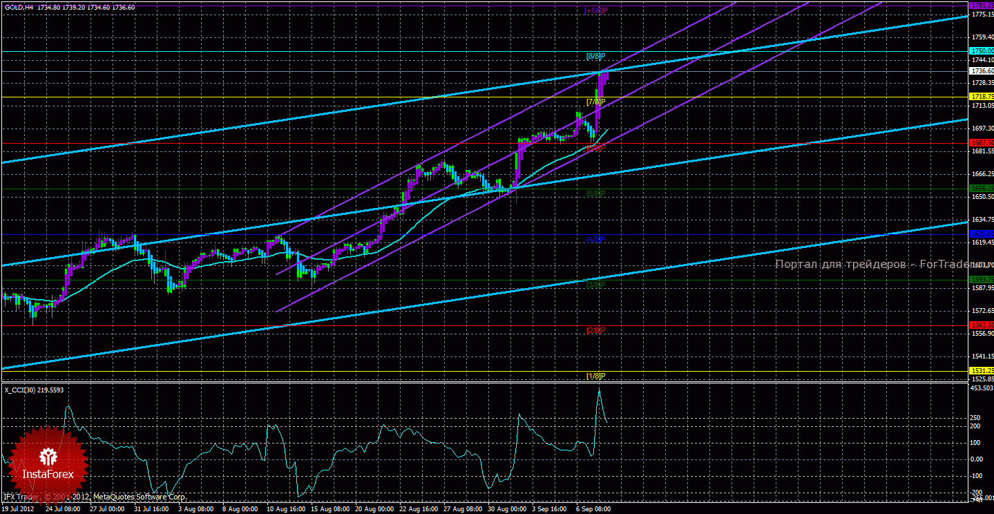 Исходя из картины, сложившейся по золоту 10 сентября, видно, что инструмент сохраняет перспективы восходящего движения, но сейчас может начаться нисходящая коррекция. Старший канал направлен наверх, что свидетельствует о восходящем направлении движения глобального тренда. Младший канал также направлен наверх, что означает восходящее направление движения и в среднесрочном плане. На данный момент цена находится выше мувинга и выше уровня Мюррея «7/8», что говорит нам о восходящем направлении движения в ближайшей перспективе. Первой целью восходящего движения, таким образом, является уровень Мюррея «8/8» — 1750,00. В случае преодоления этого уровня следующей целью для восходящего движения станет уровень Мюррея «+1/8» — 1781,25. Скользящая средняя направлена вверх, а цена находится выше нее, поэтому сейчас более вероятно восходящее движение в ближайшие дни. Хайкен Аши окрасил последние бары в фиолетовый цвет, что сигнализирует о текущем восходящем движении, поэтому лонги можно сейчас рассматривать до образования 1-2 голубых баров. Короткие позиции станут вновь актуальными после разворота одного из каналов линейной регрессии вниз и закрепления цены ниже мувинга. Индикатор CCI находится около уровня 200, что говорит о наличии сильной перекупленности инструмента, начало нисходящей коррекции в ближайшее время очень вероятно.