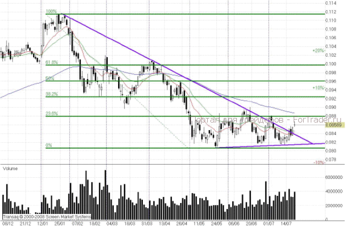 Вы скажете — а что же «ВТБ»? Акции «ВТБ» у меня куплены давно, и чего за ними следить, если они растут. Будут падать — сработает «стоп», будут расти, за лето все равно не вырастут до тех уровней, которых мне хочется. Моя глобальная цель по бумагам -годовой хай – район 11 копеек, дешевле, по хорошей схеме, я расставаться с ними не хочу. Пробой линии нисходящего тренда от января 2011 года – 8,4 копейки — меня не впечатляет. Таких пробоев было, по меньшей мере, два за июнь-июль. Похоже, что бумаги просто выползают из этого сильного тренда «боковиком». И это вовсе не значит, что они примутся ярко расти, а не будут продолжать движение в диапазоне 8,8-8,2 копейки.