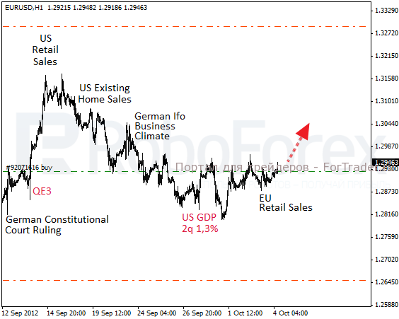Последняя статистика из США несколько обнадёживает. В пятницу станут известны данные по числу созданных в сентябре новых рабочих мест. Если верить информации агентства ADP, которая публикуется за два дня до выхода официальной оценки, то в прошлом месяце было добавлено 162k рабочих мест. Также обнадёживает рост заказов в сфере услуг: по сравнению с августом (53,7) индекс вырос до 55,1. Однако несмотря на все манипуляции с процентными цифрами, уровень безработицы, по всей видимости, снова поднимется до 8,2%.