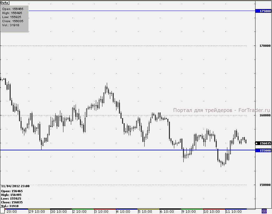 Как было видно вчера, уже вторая попытка закрепления ниже важнейшего уровня 155 000 пунктов не удалась. Таким образом, нисходящий тренд не получил своего развития. Вероятно, сегодня или завтра нам удастся увидеть очередную попытку захода вниз. Однако стоит отметить, что отскок на уровень 160 000 пунктов также вероятен.
