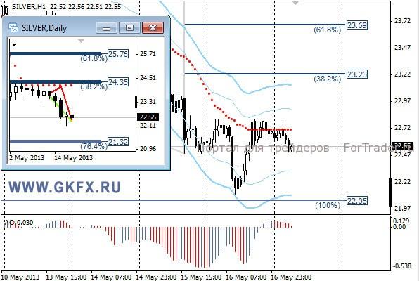 Цены на серебро снижались к недавним минимумам в район 22,10, но к концу дня вернули утраченное. Сегодня будет очередная попытка снизиться к минимумам с октября 2010 года. Серебро также как золото сутра стремится вниз, поэтому зайти в рынок очень рискованно, можно попасть под откат. Традиционно делаю два варианта движения цены на неделю, основной красный и альтернативный зеленый. Значимые уровни на сегодня отмечены на часовом графике. Индикатор АО находится у нуля, указывая на неопределенность. Индикатор тренда указывает на снижение. Вне рынка.