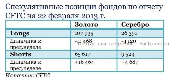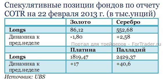 По отчету  COTR  длинные позиции в золоте и серебре  продолжали снижаться.  Золото  показало максимальный прирост коротких позиций за последние 15 лет  и минимальное количество открытых длинных позиций с мая 2012 г. Серебро показало максимальный прирост коротких позиций с августа 2005 г.  Платиноиды продолжали демонстрировать рост, но темпы прироста существенно снизились.