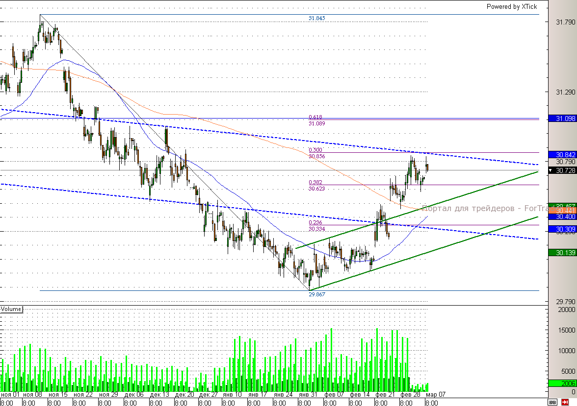 Сегодняшнее снижение российской валюты обусловлено в основном низкими ценами на нефть, которые за вчерашний день потеряли более 1% и продолжают выглядеть очень слабыми. На этом фоне котировки пары доллар/рубль вновь подобрались к уровню 30,85 и могут предпринять попытку штурма данной отметки в самое ближайшее время. Закрепление выше 30,85 может ослабить рубль до 31,1. Между тем помочь доллару в этом устремлении могут все те же цены на «черное золото», а также вероятное снижение фондовых рынков развитых стран на фоне их локальной перекупленности.