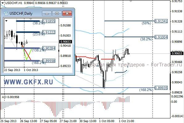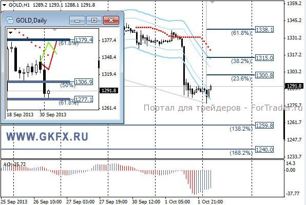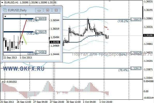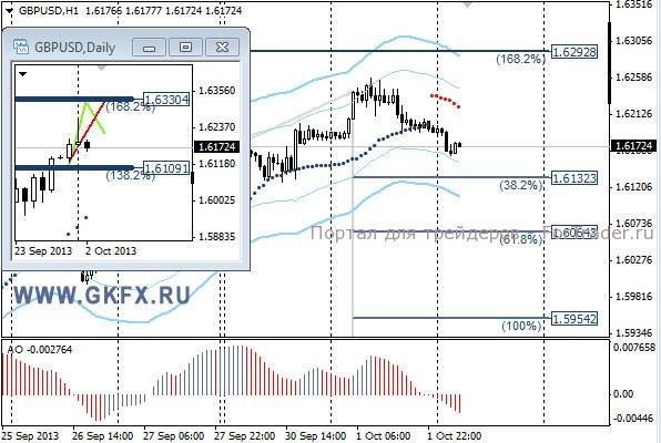 Пара EURUSD поднималась к первой цели по рекомендации, но на этом ее рост иссяк. Данные по безработице оказались смешанными. В Германии безработица выросла, а по Еврозоне в целом снизилась. Взгляд участников рынка был смещен на доллар. Приостановку работы правительства в США, рынок воспринял спокойно. Доллар получил поддержку от производственных данных по США. На эту неделю традиционно рассматриваю два варианта возможного движения цены, основной красный и альтернативный зеленый. Значимые уровни на сегодня отмечены на часовом графике. Индикатор АО находится в отрицательной зоне и снижается, указывая на желание пары направляться вниз в данное время. Индикатор тренда указывает на снижение. Вне рынка.