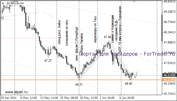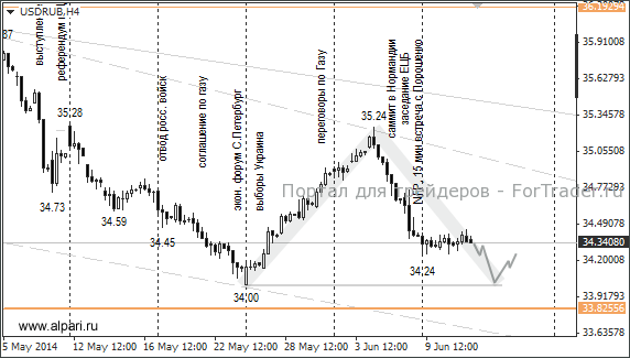 В 12:00 мск ЕЦБ опубликует ежемесячный отчёт. В 13:00 мск выйдет отчёт по промышленному производству еврозоны за апрель. Ожидается, что оно увеличилось на 0,4% в месячном исчислении при -0,3% в марте и 0,9% в годовом против -0,1% в годовом. Пожалуй, в это время и решится, куда двинется евро на европейской сессии. Если данные разочаруют инвесторов, то можно ещё разок рассмотреть падение евро к 1,35. При падении евро к доллару и при отсутствии негативных новостей с Украины курс евро снизится до 46,30 руб. По доллару целью остаётся уровень 34 рубля.