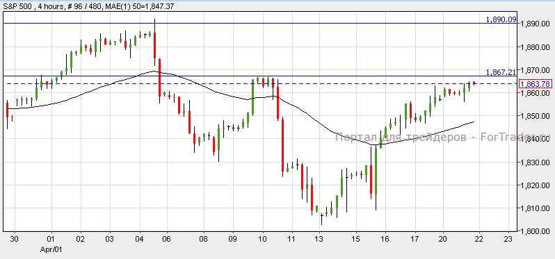 Индексы США завершили торговую сессию понедельника в зеленой зоне, NASDAQ добавил к стоимости 0.72%, а Dow Jones добавил 0.25%. Пятый день подряд, торги на Уолл-стрит закрываются повышением на фоне выхода квартальных отчётов разных компаний. В период пасхальных праздников торговая активность значительно снизилась. Индекс S&P 500 вырос на 0.38%. Согласно техническому анализу графика, S&P 500 не пробил уровень сопротивления 1,867. При задержке на этом уровне, индекс может вернутся к отметке 1,850. Однако, прорыв уровня сопротивления может привести индекс к следующему уровню сопротивления 1,890. Согласно прогнозам, объем продаж жилья на вторичном рынке незначительно изменится и составит 57 млн против 4.60 млн ранее.