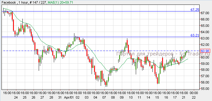 Акции Facebook выросли на 3.90% ($2.30 за акцию), закрывшись на цене 61$. На этой неделе Facebook опубликует квартальный отчёт о доходах компании. Согласно техническому анализу 1-часового графика, выход позитивного отчета спровоцирует рост к следующему уровню сопротивления на отметке 67$, а негативный отчет вернет акции к отметке 55$.