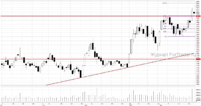 Рассмотрим акции Лукойла с позиции технического анализа. С начала года котировки формировали на дневном графике модель восходящий треугольник, с сопротивлением на уровне 1 980 р. и линией среднесрочного восходящего тренда в районе 1 920 р. Вчера покупателям удалось начать реализацию модели, пробив на большом объеме сопротивление. Целью полной реализации моедли будет выступать достижение отметки на 2 080 р. покупателями. В этом районе остался открытый геп от 25.07.2008 г. Однако, ближайшим препятсвием на пути у покупателей может стать уровень коррекции 161,8% по Фибоначчи от феварльского снижения в районе 2 040 р.