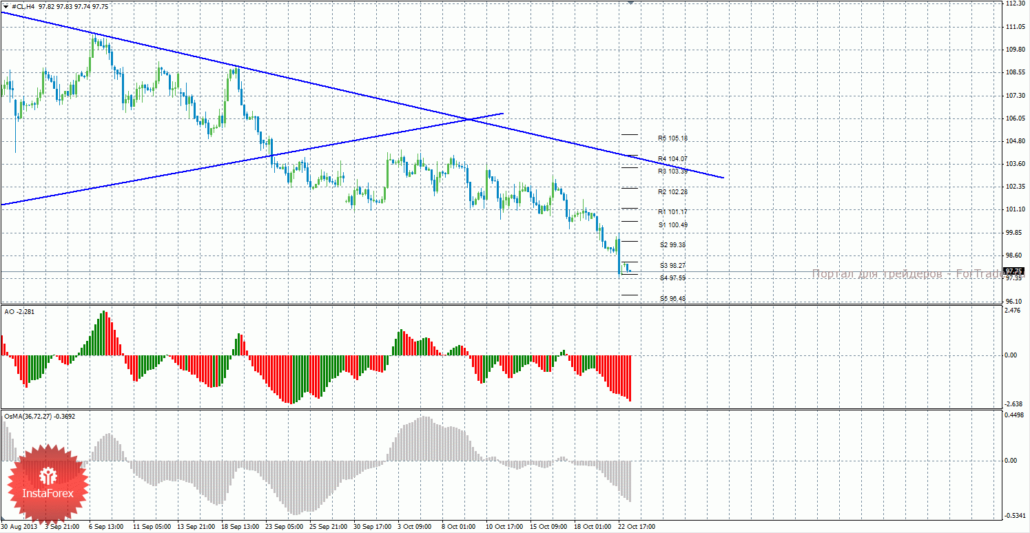 Анализ сырой нефти за 23 октября показывает, что цена продолжает нисходящее движение и преодолела уровень поддержки S3, оба индикатора по-прежнему направлены вниз. Нисходящее движение может продолжиться с целями S4 – 97,59 и S5 – 96,48, если цена останется ниже уровня 98,27. Может начаться новая восходящая коррекция с целями 99,38 и 100,49, в случае, если цена закрепится выше уровня 98,27. Нисходящая линия тренда сейчас является актуальной и оказывает поддержку торгующим на понижение. Индикатор Awesome показывает текущее нисходящее движение, так как последний закрытый бар красного цвета. OsMA также направлен вниз, что говорит о нисходящем характере движения и в более долгосрочном плане. Закрепление цены выше уровня 98,27 может спровоцировать виток восходящей коррекции.