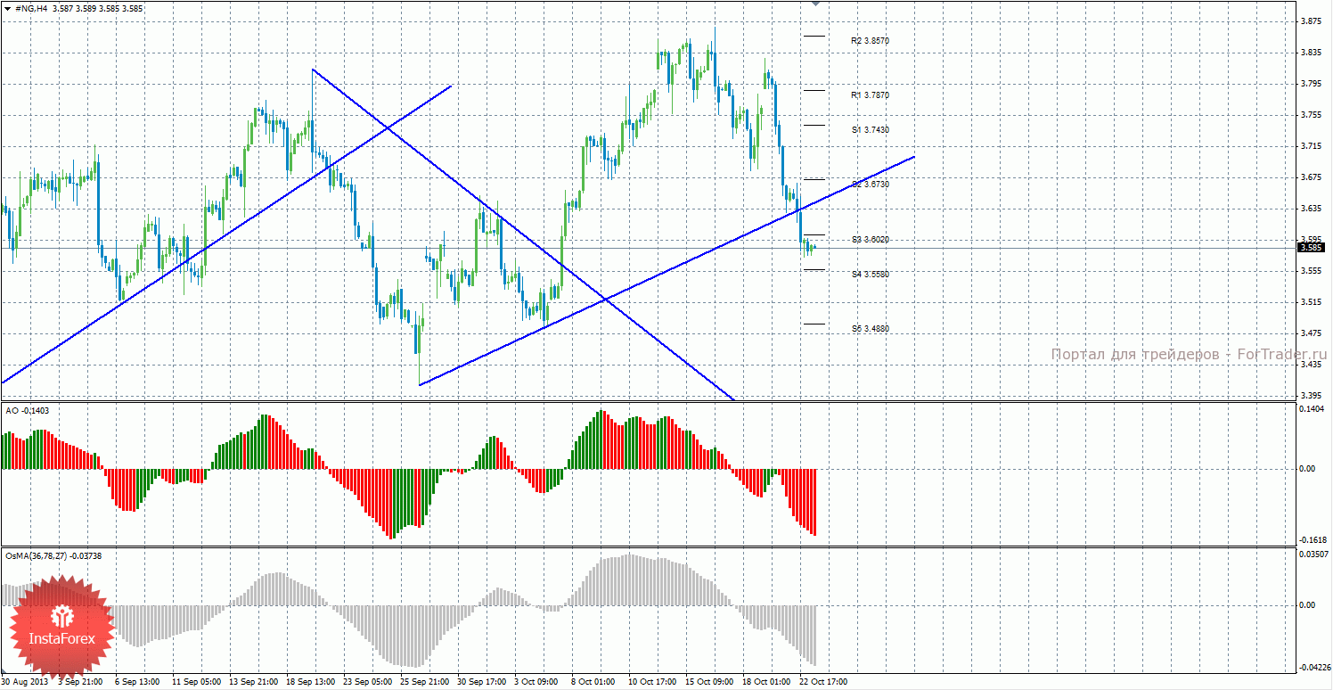Анализ природного газа за 23 октября показывает, что цена закрепилась ниже восходящей линии тренда, поэтому тенденция на рынке поменялась на нисходящую. На данный момент актуально нисходящее движение с целями уровни поддержки S4 — 3,5580 и S5 – 3,4880, если цена останется ниже уровня 3,6020. Целью для возможного начала восходящей коррекции выступают уровни 3,6730 и 3,7430, но, если цена закрепится выше уровня 3,6020. Восходящая линия тренда больше не актуальна, так как цена преодолела ее. Индикатор Awesome показывает локальное нисходящее движение, последний закрытый бар окрашен в красный цвет. OsMA также направлен вниз, что сигнализирует о нисходящем движении цены на газ и в более долгосрочной перспективе. Закрепление выше уровня 3,6020 может спровоцировать коррекционное движение.