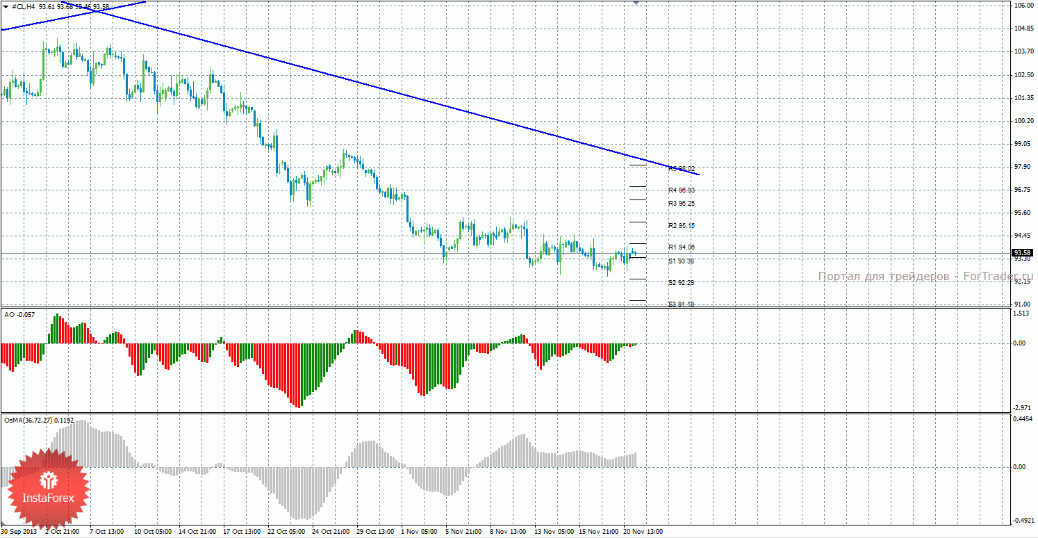 Анализ сырой нефти за 21 ноября показывает, что цена продолжает слабое коррекционное движение, о чем сигнализируют оба индикатора, направленные наверх. Нисходящее движение может возобновиться с целями S2– 92,29 и S3 – 91,19, если цена закрепится обратно ниже уровня 93,38. Может продолжиться виток восходящей коррекции с целями 94,06 и 95,15, в случае, если цена останется выше уровня 93,38. Нисходящая линия тренда сейчас является актуальной и оказывает поддержку торгующим на понижение, но цена находится довольно далеко от нее. Индикатор Awesome показывает текущее восходящее движение, так как последний закрытый бар зеленого цвета. OsMA также развернулся наверх, что говорит о восходящем характере движения и в более долгосрочном плане. Закрепление цены ниже уровня 93,38 может спровоцировать возобновление нисходящего тренда.