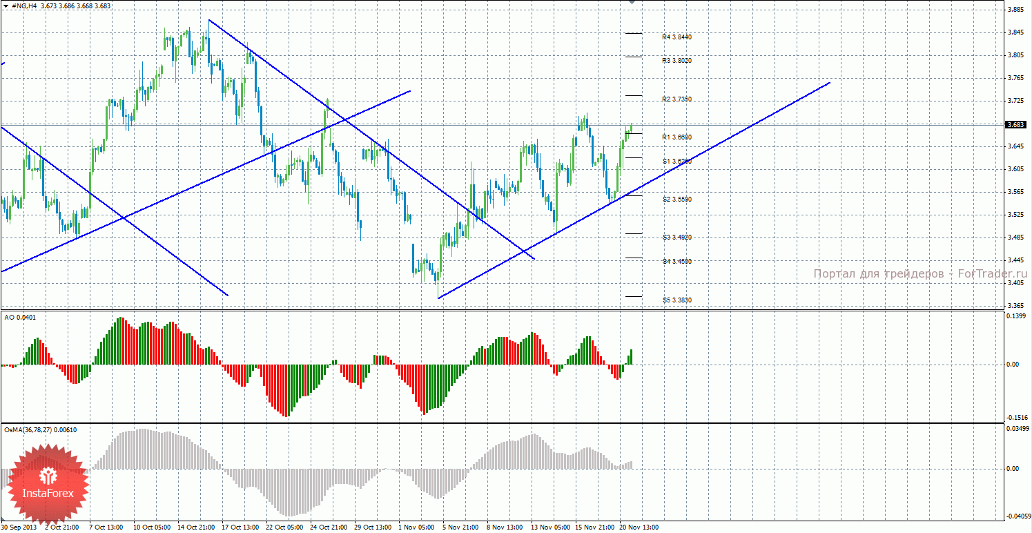 Анализ природного газа за 21 ноября показывает, что цена отработала восходящую линию тренда и отскочила от нее, закрепившись выше уровня сопротивления 3,6680. На данный момент актуально восходящее движение с целями уровни сопротивления R2 — 3,7350 и R3 – 3,8020, если цена останется выше уровня 3,6680. Целями для возможного возобновления нисходящей коррекции выступают уровни поддержки 3,6260 и 3,5590, если цена закрепится ниже уровня 3,6680. Построена новая восходящая линия тренда, которая оказывает поддержку торгующим на повышение. Индикатор Awesome показывает локальное восходящее движение, последний закрытый бар окрашен в зеленый цвет. OsMA также развернулся вверх, что сигнализирует о восходящем движении цены на газ и в более долгосрочной перспективе. Отскок цены от линии спровоцировал возобновление восходящего тренда.
