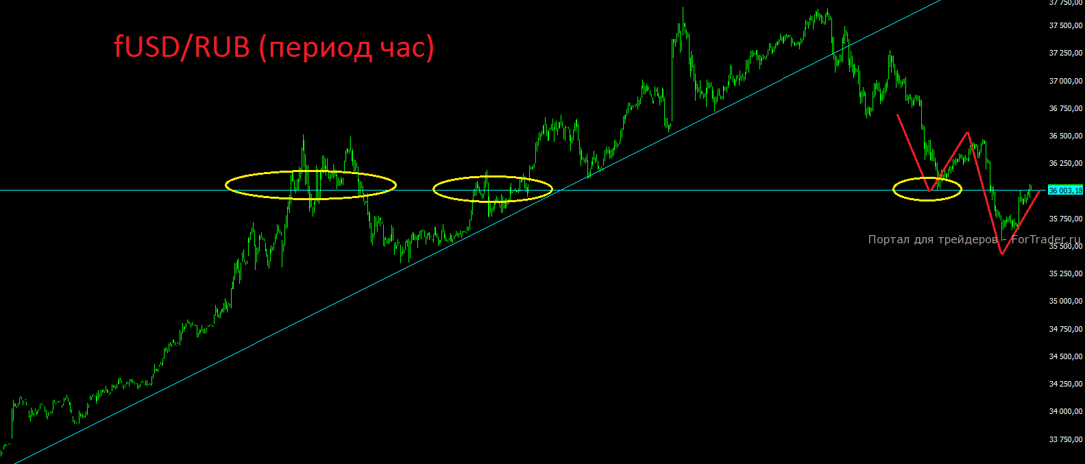 Если посмотреть на динамику фьючерса по валютной паре доллар-рубль то он чётко вернулся обратно к отметке 36000 пунктов, как я писал в начале неделе. Ранее пробитый уровень поддержки теперь тестируется в качестве сопротивления и на мой взгляд сейчас есть все шансы у цены закрыть текущую неделю выше данной отметки.