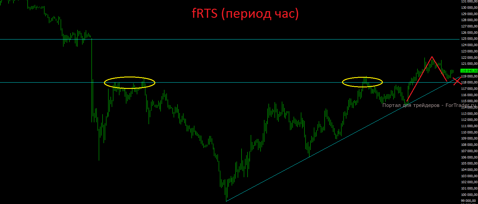 По фьючерсу на индекс РТС, как и писал в понедельник и вторник, жду небольшое снижение, но не ниже отметки 118000, где проходит важная поддержка. Данная отметка была раньше уровнем сопротивления, но после пробоя стала сильной поддержкой и вчера практически мы видели тест этого уровня на прочность, не дошли всего 500 пунктов до него. Сегодня диапазон колебаний будет тот же 118000-121000. Основная зона продаж 121000-121500. Теперь всё очень явно и очевидно! Если цена закрепится на протяжении 3 часов подряд ниже отметки 118000, то откроется дорога к отметке 114000 и возможно ниже. Закрытие дня ниже отметки 118000 даст ещё более сильный сигнал вниз, и именно тогда можно будет смело увеличивать короткие позиции, а пока больших позиций, направленных вниз торопиться открывать не стоит, лучше дождаться подтверждения.