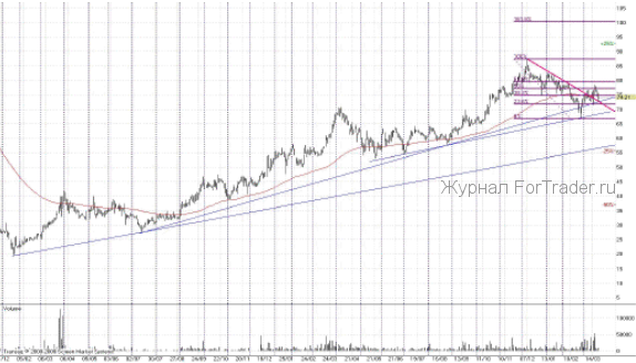 Узловым сейчас стал рубеж 74 рубля, так как здесь, кроме среднесрочного восходящего тренда, пролегает нисходящий тренд от 7 декабря 2010 года. Этот тренд пробит, но бумагам не удается качественно оттестировать его как поддержку, они периодически пилят этот рубеж. Тем не менее, с временным фильтром можно ставить «стоп» за этим уровнем.
