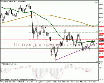 Дневной ценовой график показывает цель 1587 пунктов. Движение ожидаем по трендовой линии. MACD укрепил позицию в положительной зоне. Среднесрочная перспектива роста индекса в канал 1670-1566 пунктов.