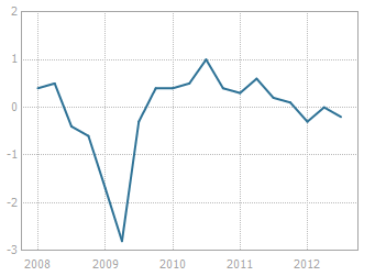 По итогам вчерашних торгов доллар США смог укрепиться по отношению к основным валютам. Исключением стали евро и швейцарский франк, показавшие небольшой рост. Однако, сегодняшний день будет богат на выход макростатистики для еврозоны, что может привести к значительным движениям на рынке. Ожидаются данные по ВВП валютного союза в третьем квартале года, а также по инфляции в октябре. По прогнозам рынка, ВВП за июль-сентябрь мог снизиться на 0.2%, как и во втором квартале (см. график ниже), технически подтверждая, что экономика региона находится в рецессии. Сегодня уже были опубликованы данные по Германии, где валовый продукт вырос на 0.2% в третьем квартале (предыдущее: 0.3%), причем годовой темп роста упал с 1% до 0.9%.