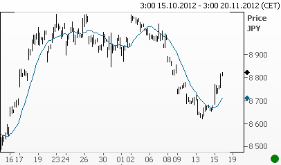 Одно из самых сильных движений последних двух дней на валютном рынке – резкое падение курса японской иены. Так, доллар США вырос сегодня утром против иены до значения 80.93, самого высокого уровня с 27 апреля, хотя еще в начале недели находился у отметки 79.50. Евро также укрепился против японской валюты до уровня 103.19, прибавив за два дня более 200 пунктов. Причиной столь резкому падению иены послужило заявление премьера Японии Ноды о возможности проведения досрочных парламентских выборов, на которых, вероятно, одержит победу Либерально-демократическая партия, поддерживающая смягчение денежно-кредитной политики. Падение иены оказало поддержку акциям компаний-экспортеров, а токийский индекс Nikkei 225 вырос до недельного максимума – 8823.79 (см график ниже).