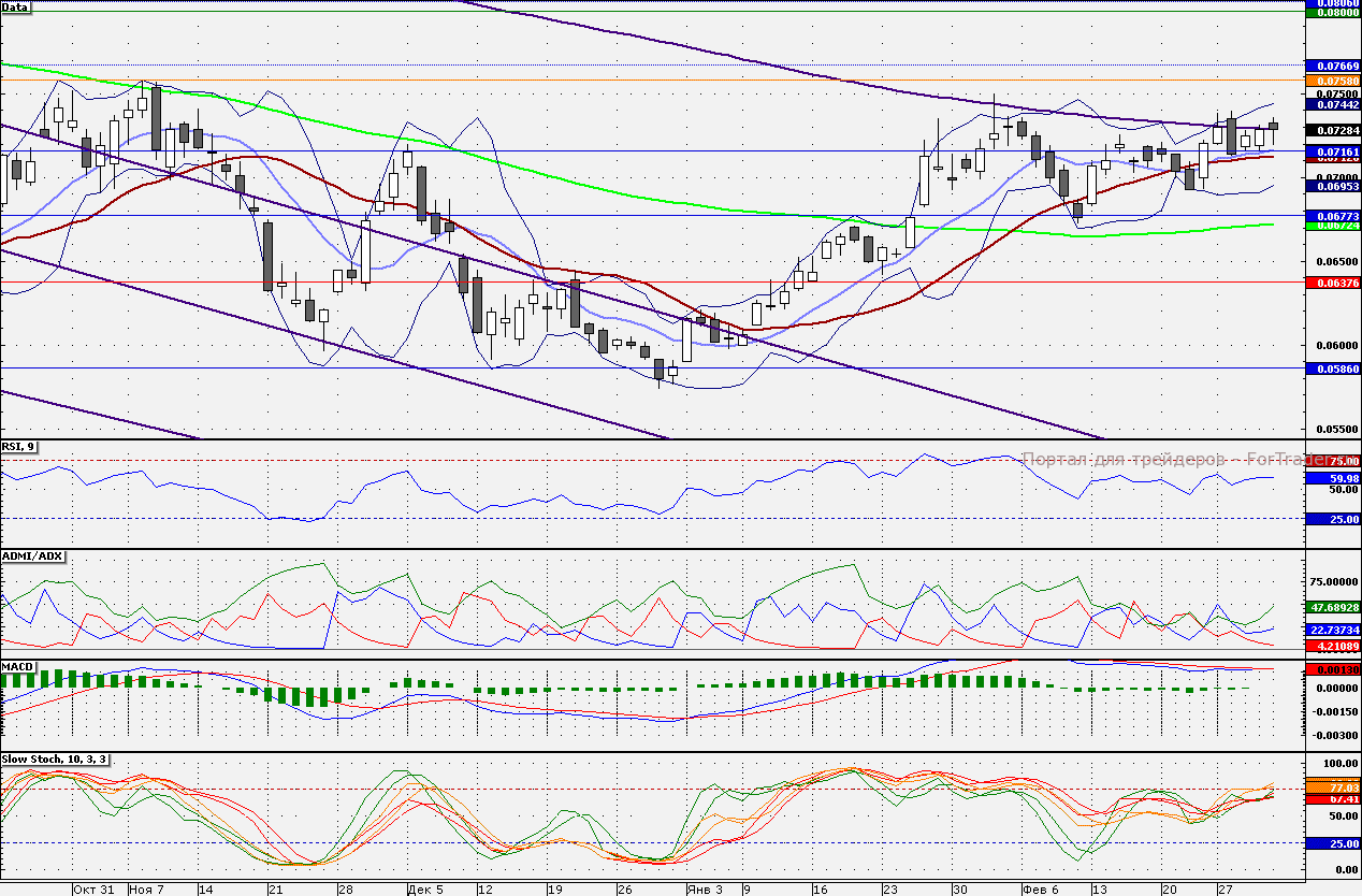 Акции банка закрылись на 200-дневной скользящей средней. Внешний фон располагает к тестированию поддержки, которой является район 10- дневной скользящей средней – 7,160 коп. От данной отметки стоит наращивать лишь внутридневные позиции.