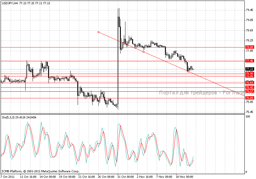 Краткосрочно интервенции Банка Японии показали свою низкую эффективность, а поэтому в ближайшее время вряд ли будут проводиться. Достаточно агрессивно продажи могут проходить до района 77,13-77,00, в понедельник игроки могут наращивать короткие позиции. Этому будет способствовать и позитивные новости по ВВП Японии за 3 квартал.