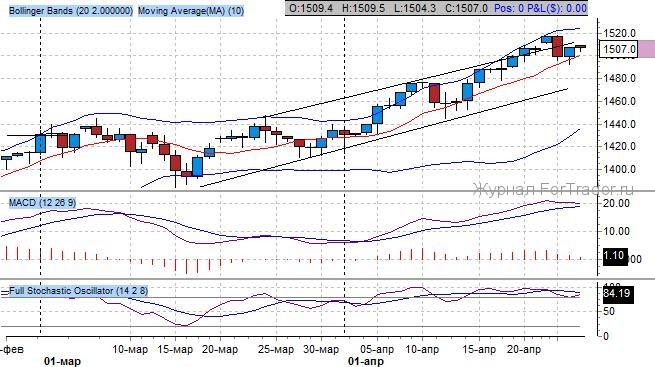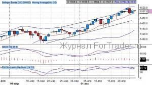Котировки достигли и преодолели значимый уровень 1500 $/тройскую унцию – психологическая зона и исторический максимум. Текущее движение реализовало потенциал комбинации японских свеч «утренняя звезда», что отразилось в движении котировок вверх к уровню сопротивления на 1500 $/тройскую унцию. Далее ожидаем полноценную коррекцию от уровня 1500 $/тройскую унцию с целью закрытия «гэпа» от 22 апреля и достижения повышательного уровня поддержки. Сейчас это уровень 1480 пунктов.