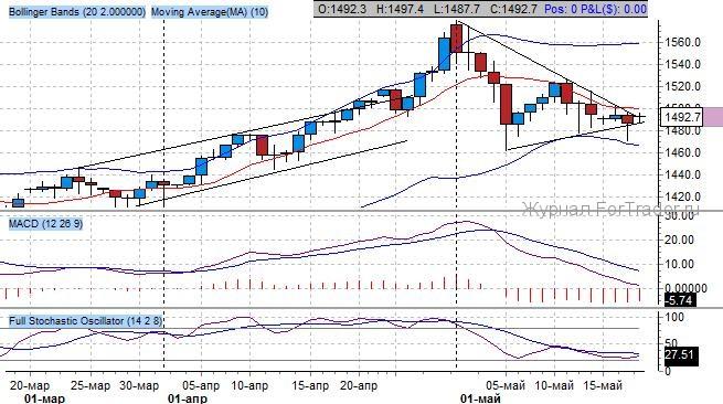 Среднесрочный тренд понижательный, текущая цель движения – выход из «треугольника» в районе 1480-1500 $/тройскую унцию укажет на дальнейший тренд.