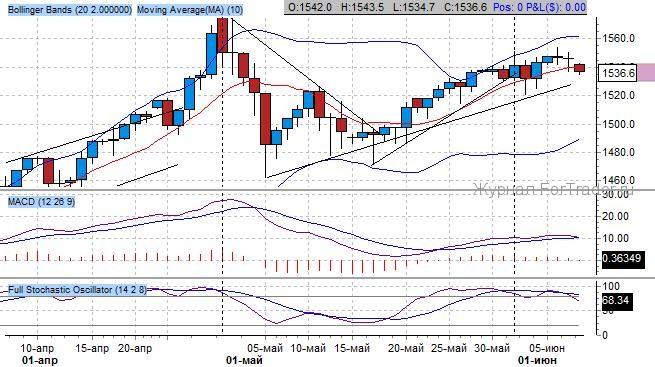 Индикатор Bollinger Bands подтверждает правильность повышательной направленности котировок при выходе из треугольника. Разворотный импульс начался с минимума на 1460 $/тройскую унцию. Приоритетны покупки до верхней границы канала на 1570 $/тройскую унцию.