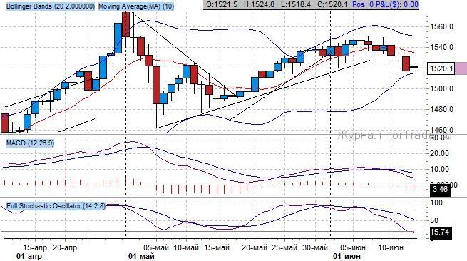 Индикатор Bollinger Bands подтверждает правильность понижательной направленности котировок при развороте от верхней границы. Разворотный импульс начался с максимума на 1550 $/тройскую унцию. Были приоритетны продажи до нижней границы канала на 1510 $/тройскую унцию, а далее прогнозируем покупки до предыдущей вершины на 1550 $/тройскую унцию.