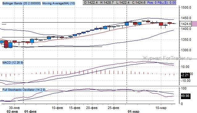 Котировки находятся в среднесрочном повышательном канале с нижней границей на 1380 пунктов и верхней на 1450 пунктов. Котировки все еще остаются над значимым уровнем 1400 пунктов – психологическая зона, проходящая через экстремумы конца прошлого года. Текущее движение реализует потенциал комбинации японских свеч «вечерняя звезда», что предопределяет движение котировок к уровню поддержки на 1400 пунктов.