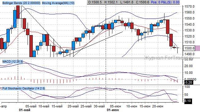 Индикатор Bollinger Bands подтверждает правильность понижательной направленности котировок при развороте от верхней границы. Разворотный импульс начался с максимума на 1550 $/тройскую унцию. Были приоритетны продажи до нижней границы канала на 1500 $/тройскую унцию, а далее прогнозируем покупки до предыдущей вершины на 1560-1570 $/тройскую унцию.