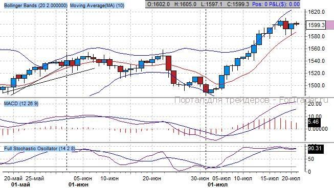 Индикатор Bollinger Bands подтверждает правильность ожиданий понижательной направленности котировок при развороте от верхней границы. Разворотный импульс реализован с максимума на 1600 $/тройскую унцию. В настоящий момент отмечаем продажи от установления новой вершины на 1610 $/тройскую унцию.