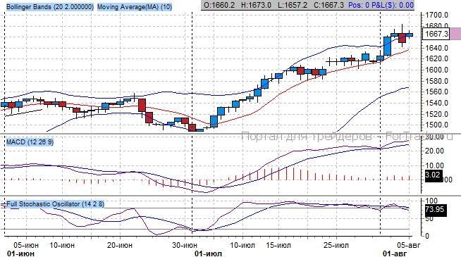 Текущее движение приобрело повышательный импульс от комбинации японских свеч «гэп вверх» от 22 июля. Накануне котировки устроили ралли с пробоем верхней границы среднесрочного повышательного канала на 1650 $/тройскую унцию. Отмечаем проторгованное основание на уровне 1670 $/тройскую унцию. Значимый уровень поддержки располагается на проторгованном основании 1560-1580 $/тройскую унцию.