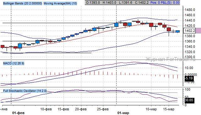 Котировки находятся в среднесрочном повышательном канале с нижней границей на 1380 пунктов и верхней на 1450 пунктов. Котировки пробили значимым у накануне уровень 1400 пунктов – психологическая зона, проходящая через экстремумы конца прошлого года. Текущее движение реализует потенциал комбинации японских свеч «вечерняя звезда», что предопределило движение котировок к уровню поддержки на 1400 пунктов.