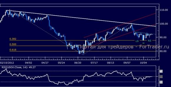Цены тестируют сопротивление по отметке, которая станет основанием для формирования линии шеи в обратной фигуре Голова и Плечи (92.34), с прорывами вверх, направленными к области 97.80. Поддержка установлена в области 87.66, 38,2% коррекция Фибоначчи. Прорывы вниз направлены в область 50% уровня при 83.76.