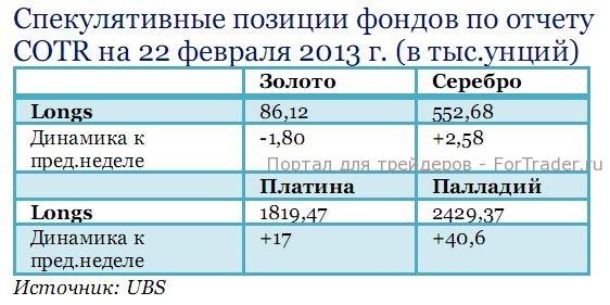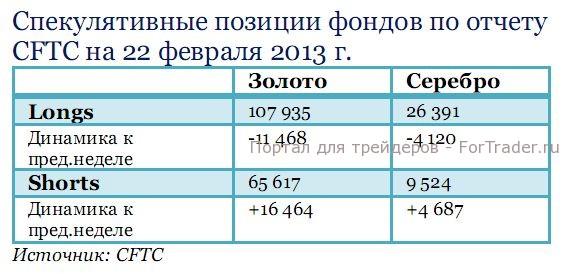 По отчету COTR длинные позиции в золоте и серебре  продолжали снижаться. Золото показало максимальный прирост коротких позиций за последние 15 лет  и минимальное количество открытых длинных позиций с мая 2012 г. Серебро показало максимальный прирост коротких позиций с августа 2005 г.