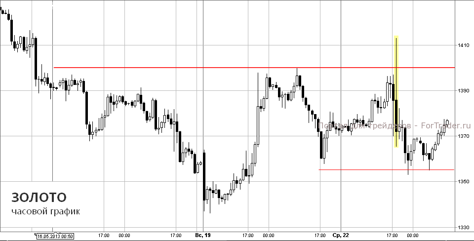 Рост цен золота в среду после слов Бернанке о преждевременности разговоров о сворачивании QE («QE Exit несет риск замедления экономического роста и снижении инфляции ниже целевого уровня») позволил быкам выйти выше отметки $1400 за унцию, и почти протестировать сопротивление $1420. Однако уже в течение этого же часа рынок резко поменял свое мнение, фиксация спекулятивных «лонгов» привела к мгновенному снижению котировок металла. Причиной тому стали слова о принципиальной готовности ФРС к завершению стимулирующих программ на ближайших заседаниях в этом году, если экономическая ситуация будет этому способствовать.