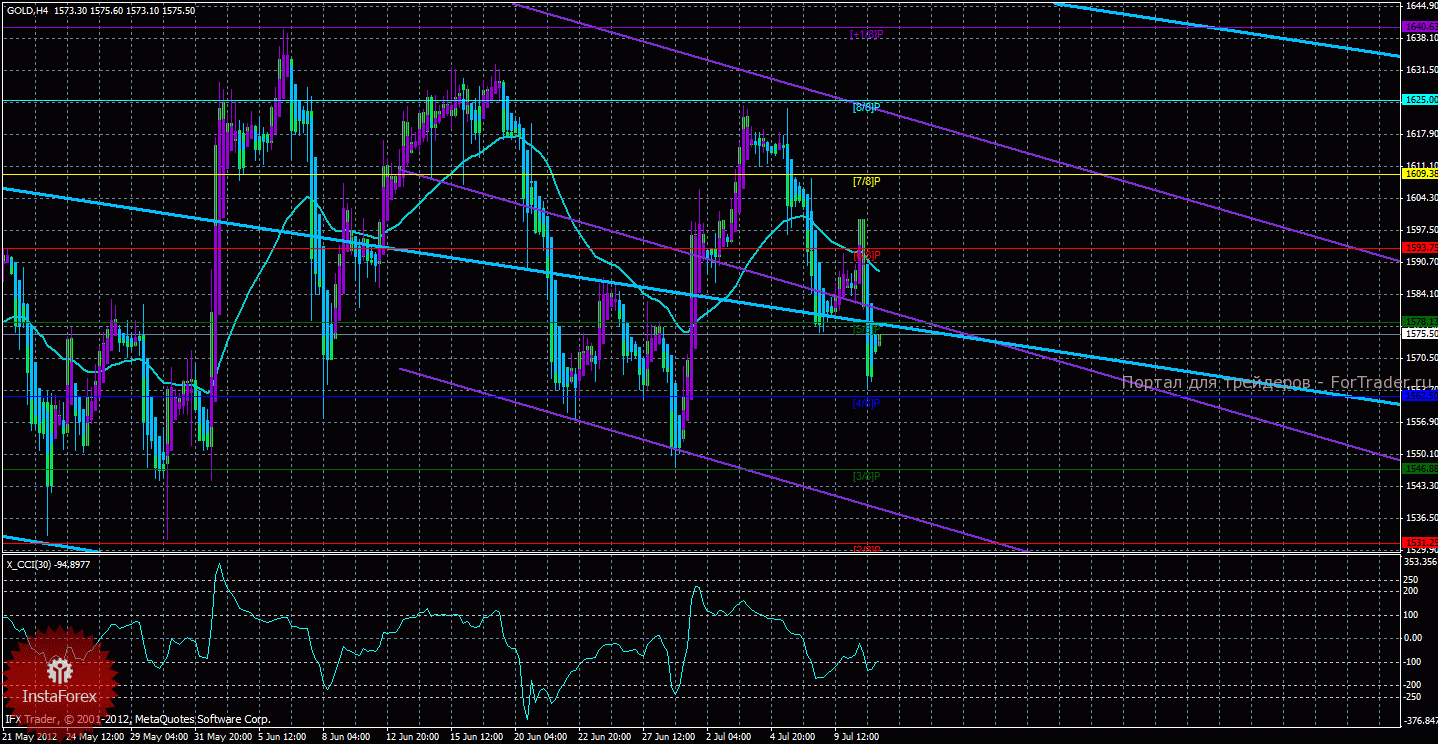 Исходя из картины, сложившейся по золоту 11 июля, видно, что инструмент скорректировался и даже пробил мувинг, но пробой этот оказался ложным и пара вновь опустилась ниже скользящей средней. Старший канал направлен вниз, что свидетельствует о нисходящем направлении движения глобального тренда. Младший канал также направлен вниз, что означает нисходящее направление движения и в среднесрочном плане. На данный момент цена находится ниже мувинга и ниже уровня Мюррея «5/8», что говорит нам о нисходящем направлении движения в ближайшей перспективе. Первой целью нисходящего движения, таким образом, является уровень Мюррея «4/8» — 1562,50, этот уровень уже был отработан ценой, но пока что не преодолен. В случае преодоления этого уровня Мюррея, следующим таргетом для возможного снижения курса золота будет выступать уровень Мюррея «3/8» — 1546,88. Скользящая средняя направлена вниз, а цена находится вниз нее, поэтому сейчас более вероятно нисходящее движение в ближайшие дни. Хайкен Аши окрасил последние бары в голубой цвет, что сигнализирует о текущем возобновлении нисходящего движения, поэтому короткие позиции можно вновь поддерживать и рассматривать до разворота этого индикатора наверх. Вновь рассматривать длинные позиции можно будет после разворота хотя бы одного из каналов линейной регрессии наверх и закрепления цены выше мувинга. Индикатор CCI находится около уровня -100, что говорит о небольшой перепроданности инструмента.