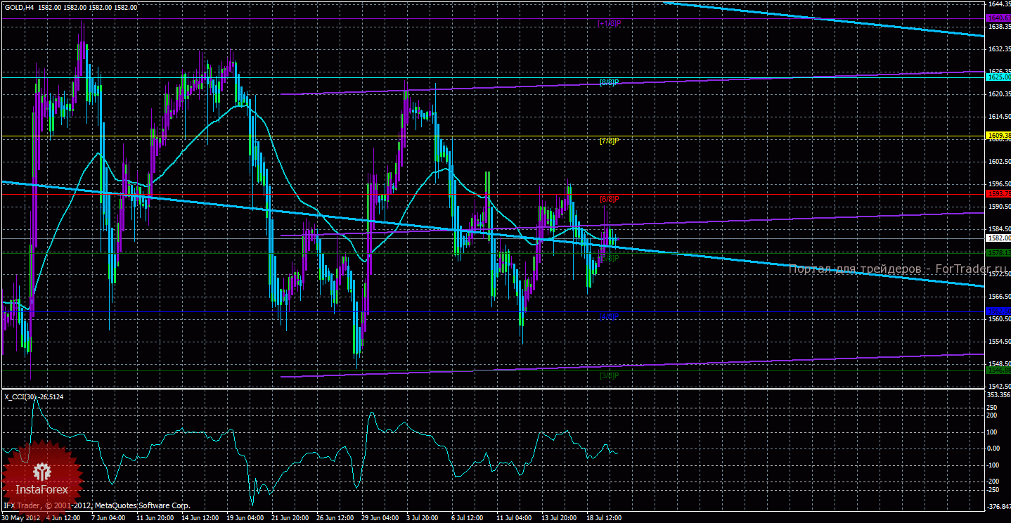 Исходя из картины, сложившейся по золоту 20 июля, видно, что инструмент закрепился ниже мувинга и на данный момент начал небольшую коррекцию, о которой говорит Хайкен Аши. Старший канал направлен вниз, что свидетельствует о нисходящем направлении движения глобального тренда. Младший канал развернулся вбок, что означает боковое направление движения в среднесрочном плане и постепенный разворот канала наверх. На данный момент цена находится ниже мувинга и ниже уровня Мюррея «6/8», что говорит нам о нисходящем направлении движения в ближайшей перспективе. Первой целью нисходящего движения, таким образом, является уровень Мюррея «5/8» — 1578,13, который уже был достигнут, но пока что не преодолен. В случае преодоления этого уровня Мюррея, следующим таргетом для возможного понижения курса золота будет выступать уровень Мюррея «4/8» — 1562,50. Скользящая средняя направлена вбок, а цена находится ниже нее, поэтому сейчас более вероятно нисходящее движение в ближайшие дни. Хайкен Аши окрасил последние бары в голубой цвет, что сигнализирует о текущем нисходящем движении, поэтому короткие позиции актуальны до разворота этого индикатора наверх или закрепления цены выше мувинга. Вновь рассматривать длинные позиции можно будет только после разворота хотя бы одного из каналов линейной регрессии наверх и закрепления цены выше скользящей средней. Индикатор CCI находится около нулевого уровня, что говорит об отсутствии какой-либо перекупленности или перепроданности инструмента.