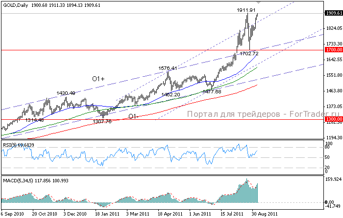 С технической точки зрения после тестирование и преодоления текущего максимума 1910.00 золото, вероятнее всего, продолжит рост к отметке 2000.00. Однако прорыв выше психологического барьера 2000.00 может оказаться затруднительным, и вероятен разворот тренда из данного района. Также разворот тренда может состояться при неудачной попытке преодолеть текущий максимум 1910.00. В обоих случаях можно ожидать динамичное снижение в направлении поддержки 1700.00.