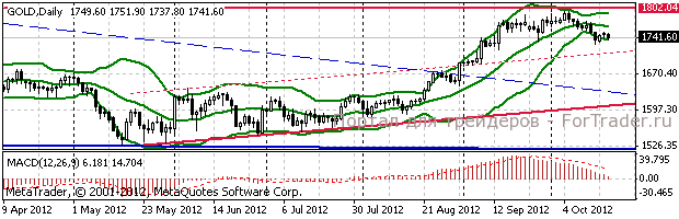 В случае восстановления выше $1765/80 (средняя линия дневного Боллинджера, максимум 9 октября) сопротивление будет встречено на $1791/96 (верхняя граница дневного Боллинджера, максимум 5 октября). Сильное сопротивление остается на $1802 (максимум сентября2011 г), преодоление которого откроет быкам дорогу на $1826.