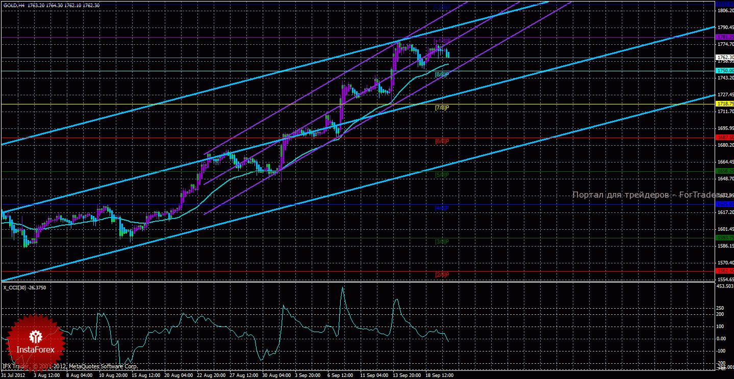 Исходя из картины, сложившейся по золоту 20 сентября, видно, что инструмент начал еще одноу коррекцию к мувингу, но пока цена находится выше мувинга, восходящее движение может возобновиться. Старший канал направлен наверх, что свидетельствует о восходящем направлении движения глобального тренда. Младший канал также направлен наверх, что означает восходящее направление движения и в среднесрочном плане. На данный момент цена находится выше мувинга и выше уровня Мюррея «8/8», что говорит нам о восходящем направлении движения в ближайшей перспективе. Первой целью восходящего движения, таким образом, является уровень Мюррея «+1/8» — 1781,25, который уже достигнут. В случае преодоления этого уровня следующей целью для восходящего движения станет уровень Мюррея «+2/8» — 1812,50. Преодоление и этого уровня позволит перерассчитать индикатору все уровни Мюррея. Скользящая средняя направлена вверх, а цена находится выше нее, поэтому сейчас более вероятно восходящее движение в ближайшие дни. Хайкен Аши окрасил последние бары в голубой цвет, что сигнализирует о текущем нисходящем движении, поэтому лонги можно будет рассматривать после образования 1-2 фиолетовых баров. Короткие позиции станут вновь актуальными после разворота одного из каналов линейной регрессии вниз и закрепления цены ниже мувинга. Индикатор CCI находится около уровня 0, что говорит об отсутствии как перекупленности, так и перепроданности инструмента.