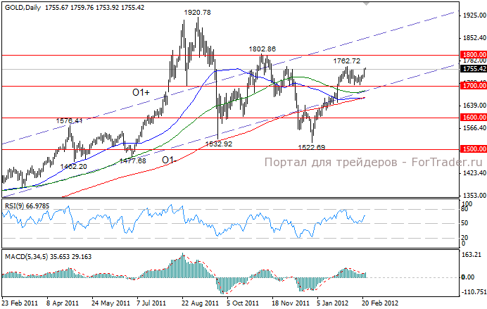 С технической точки зрения ситуация остается прежней. Обретя поддержку в районе 1700.00, золото возобновило рост, и достигло локального максимума, расположенного немного выше отметки 1760.00. Его уверенное преодоление подтвердит развитие восходящего тренда в направлении сопротивления 1800.00. Если же отметка 1760.00 преодолена не будет, не исключено обратное падение к поддержке 1700.00, прорыв ниже которой откроет дорогу снижению к 200-дневной SMA, проходящей около 1665.00. Эта поддержка является ключевой, и прорыв ниже будет означать дальнейшее падение в район 1450.00-1520.00, а также далее к отметке 1300.00.